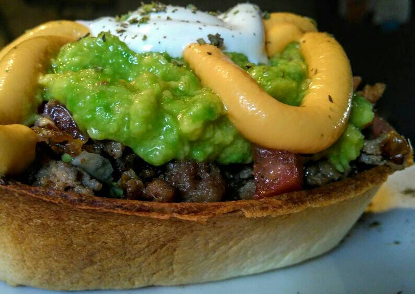 Relleno de carne molida (picada), tomates al cilantro y aguacate en una rica mezcla de queso fundido cheddar y sour cream (en mi recetario) salpicado de orégano...! Un clásico de la comida mexicana que me encanta, para compartir en familia, con amigos y con casa Cookpad...! Mary Colmenares este es de los tuyos, a lo Zabradelo...jaja...! Me acompañan a hacerlo, vamos...!