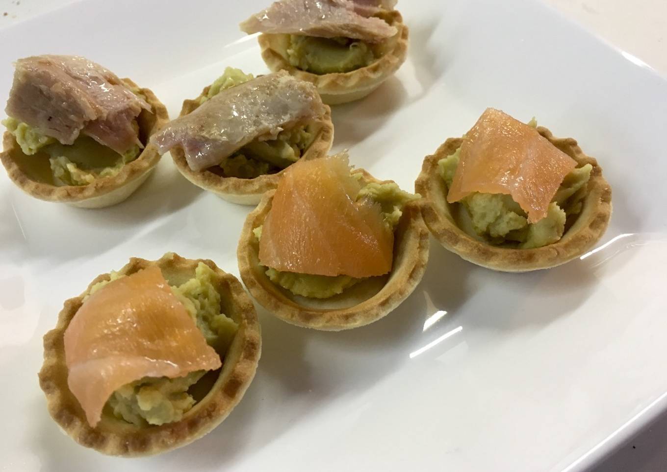 Unas mini tartaletas diferentes y originales que perfectamente pueden valer para Navidad, con relleno de hummus de aguacate y coronadas con los ahumados que más te gusten, yo en este caso he utilizado salmón ahumado y ventresca.